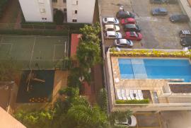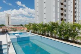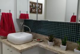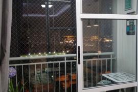 Apartamento de 2 quartos, com porcelanato e piso laminados nos quartos. Móveis planejados em todos os ambientes, sacada com fechamento em vidro e cortinas rolo.