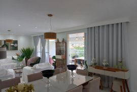 alto padrão, a 1 quadra do mar, região de condomínios residenciais. 3 suítes, jantar e estar integradas, varanda gourmet com vista para o mar e montanha, cozinha, lavanderia, despensa (ou quarto) e banheiro. Armários planejados, ar condicionado em todos ambientes, 2 vagas, lazer com piscinas aquecidas, sauna, academia, salões de festa e jogos, quadra, jardins e mini mercado