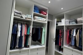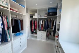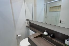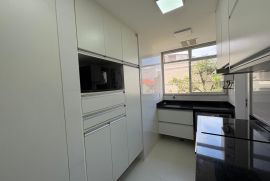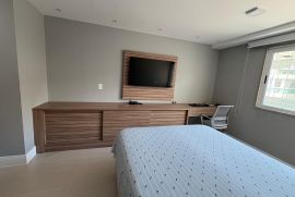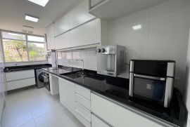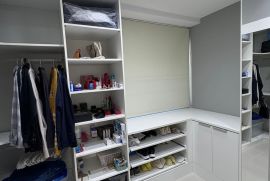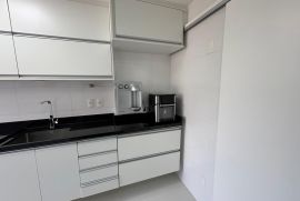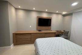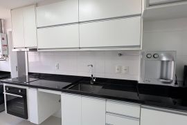Os três quartos planejados incluem uma suíte espaçosa, e um dos quartos foi transformado em closet, com fácil reversão para dormitório. A cozinha planejada, moderna e funcional, otimiza o espaço para o seu dia a dia