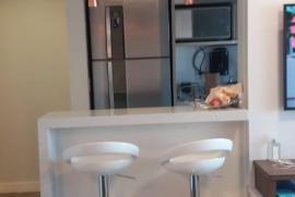 Apartamento totalmente mobiliado com 2 quartos, sendo um suíte. Apartamento com varanda gourmet e cozinha americana. Totalmente reformado, com piso de porcelanato em madeira e pias de quartzo.