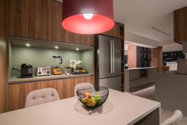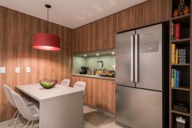 O apartamento conta com ar-condicionado LG em todos os ambientes, assegurando conforto térmico em qualquer época do ano. A cozinha americana, integrada à área social, valoriza o convívio e a experiência gastronômica.