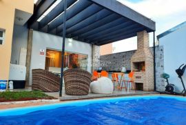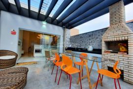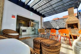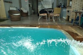 A casa tem ampla varanda gourmet com piscina