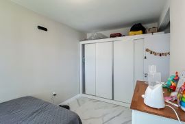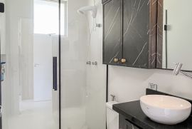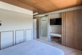 Suíte com móveis planejados, banheiro com box de vidro e ventilação natural