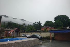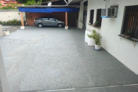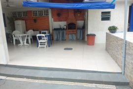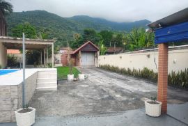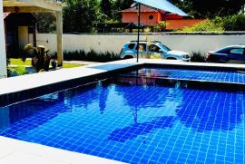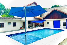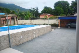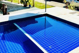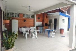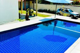 O terreno espaçoso abriga um quintal amplo com piscina, churrasqueira, varanda, garagem coberta e descoberta. O 1º andar da casa apresenta uma sala em 2 ambientes, um banheiro social, 2 quartos, uma cozinha planejada e uma área de serviço.